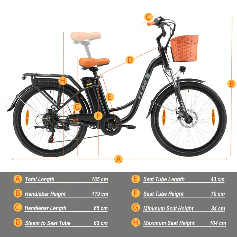 Vélo électrique TTGO YY-26ST 250 W 26 pouces City Commuter Ebike avec panier et batterie 36 V 14,5 Ah